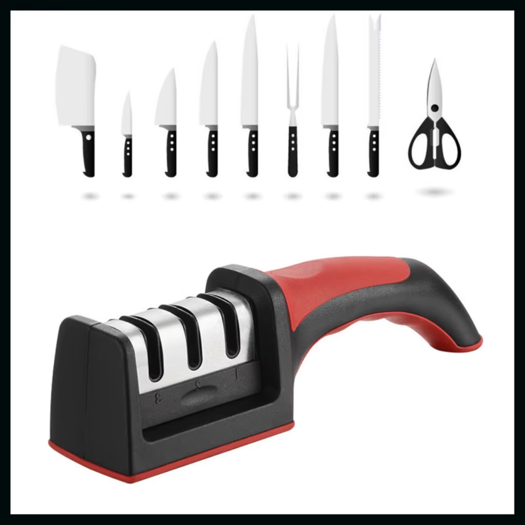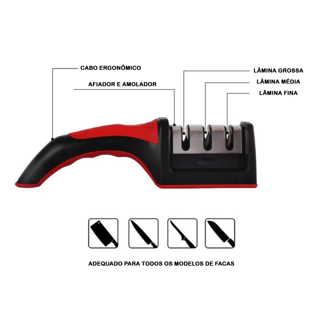 Segurança: O afiador foi projetado para ser seguro, com uma alça conveniente para uma pegada firme, evitando acidentes.
